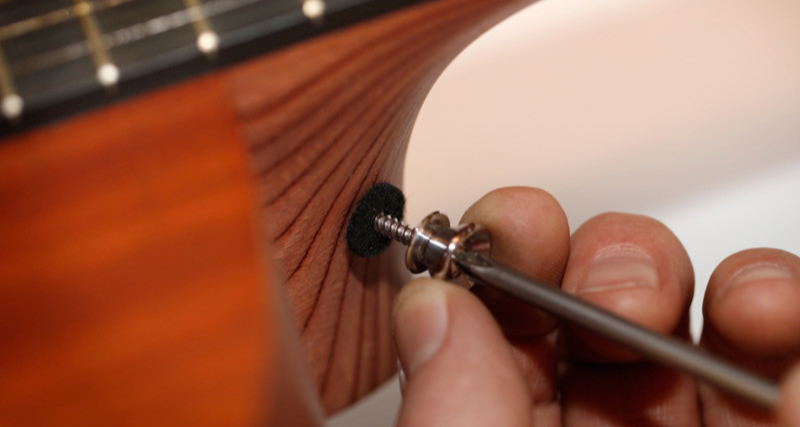 Je wil een gitaarband (strap) aan je westerngitaar monteren maar...... er zit helemaal geen bevestigingspunt aan de voorkant. Bij veel gitaren is alleen aan de bodykant een strapknob gemonteerd dus moet je de band vastzetten met een veter onder de snaren door aan de kop van de gitaar. Een stuk handiger en comfortabeler is een extra strapbutton monteren maar pas op, je kunt niet zomaar gaan boren en schroeven dus wees voorzichtig. Durf je dit projectje zelf niet aan dan breng je hem toch gewoon even bij ons. In de meeste gevallen kun je de gitaar direct weer meenemen.