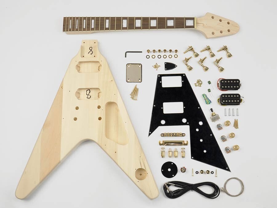 Je eigen unieke elektrische gitaar bouwen is helemaal niet zo moeilijk met de complete KIT's van Boston Music. Neem bijvoorbeeld dit FV10 pack, een Flying V model met een body van massief basswood (lindenhout) en een massieve hals van maple met een freboard van rosewood. Het leuke van dit pack is dat je eigenlijk niets meer hoeft te zagen, frezen of boren dat is allemaal al gedaan.
