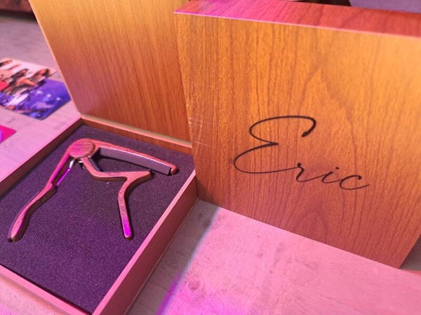 Een veel gebruikte tool bij gitaristen is de capo(daster). Met deze klem kun je de gitaar in een hogere stemming zetten zonder aan de mechanieken te draaien zeg maar. Deze trigger capo is heel makkelijk met een hand te plaatsen en verplaatsen en je krijgt er ook nog eens een fraaie opbergbox bij met daarop je eigen naam!