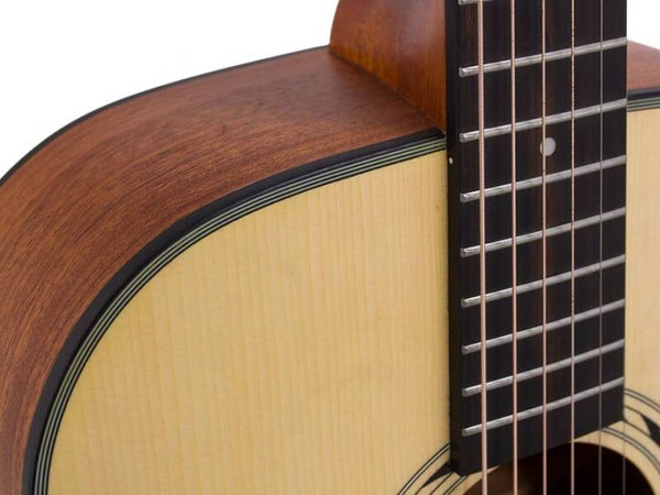 De BAB1 Dreadnought uit de MtBlanc Series is een zeer goed afgewerkte staalsnarige westerngitaar waar je zeker als starter zeer goed mee voor de dag komt. Deze gitaar heeft een bovenblad van sparrenhout en een zij en achterkant van mahonie. Geen goedkoop triplex met een dikke laklaag maar goede toonhout soorten met een mooie matte finish.