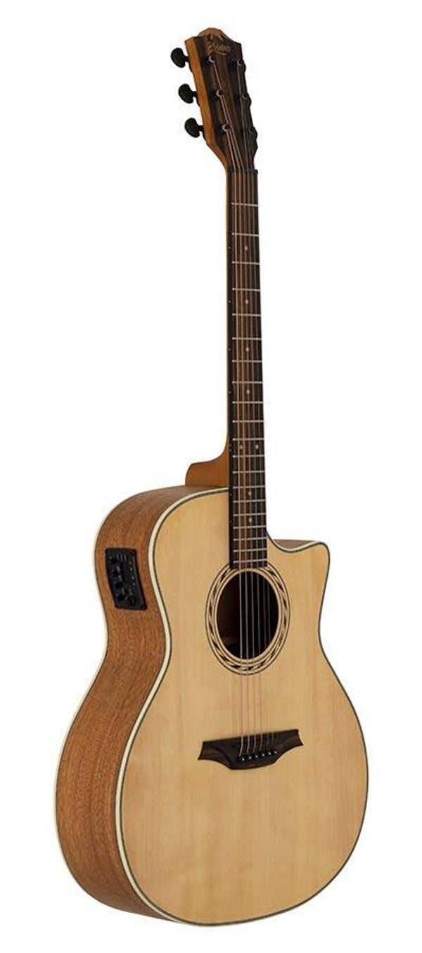 De Bromo BAT2CE uit de Tahoman Series is een zogenaamde electro-akoestische staalsnarige gitaar die je ook kunt aansluiten op een versterker. Deze gitaar heeft een massief sparrenhouten bovenblad en zij/achterkant van mahonie, deze combinatie geeft de gitaar een mooie volle maar ook heldere sound de met de jaren alleen nog maar beter zal worden. De massieve mahonie hals is uitgerust met een super slijtvast fretboard van Amara Ebbenhout met daarop zeer goed afgewerkt fretwerk. Door de cutaway in de body zijn ook de hogere posities makkelijk te bereiken.