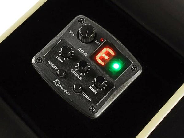 Een lage actie voorkomt pijnlijke vingertoppen. De Richwood RD12LCE heeft een zeer lage actie (afstand tussen de snaren en de hals) waardoor hij zeer licht te bespelen is. Met de verstelbare halspen (trussrod) kan de hals altijd worden aangepast om een lichte bespeelbaarheid te behouden.