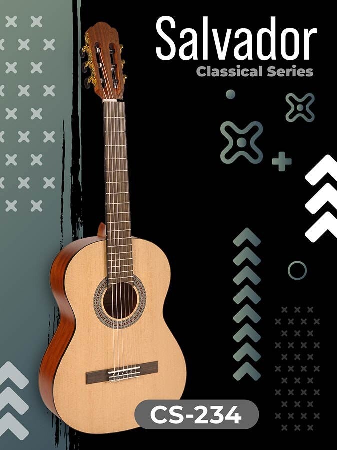 De perfecte gitaar voor kinderen tussen de 8 en 12 jaar oud die op gitaarles gaan. De Salvador CS234 is een klassieke nylonsnarige gitaar met een hele lichte bespeelbaarheid en een hele volle klank.